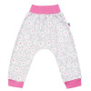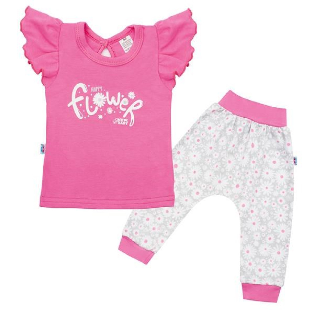 Kojenecká soupravička české značky New Baby Happy Flower pro miminka. Obsahuje tričko a tepláčky. Tričko zdobí nápis Happy flower a šmrncovní volánkové rukávky. Zapínání na cvoček u krčku na zadní straně. Tepláčky mají širší lem, jsou zúžené na nohavičkách s lemem a jsou celopotištěné květinkami. Složení: 100% bavlna.