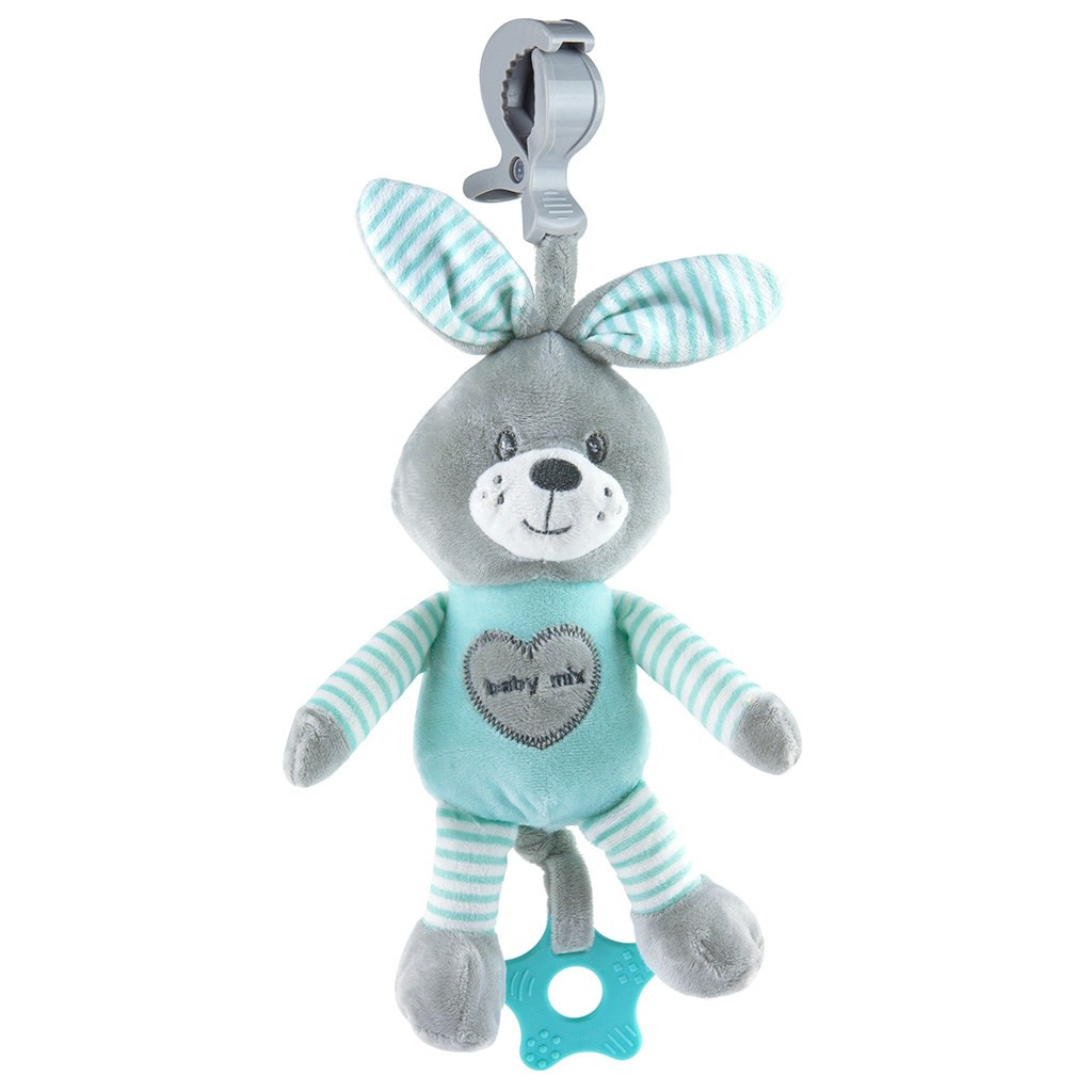 Krásná barevná plyšová hračka Baby Mix pro miminka. Hračka po natáhnutí hraje příjemnou melodii, která miminku pomáhá při usínání. V jedné nožce se ukrývá pískátko, ve druhé chrastítko. Hračká má klip na upevnění ke kočárku. Rozměry 25 cm.