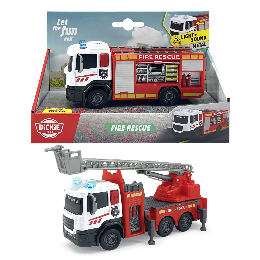 Hasičské auto na volnoběh, světelná a zvuková fnkce, kovová kabina, pohyblivé části. Délka 17 cm. 2 druhy: s otevíracím bokem nebo s výsuvným žebříkem. Nelze vybrat druh, dodáváme dle skladové dostupnosti.