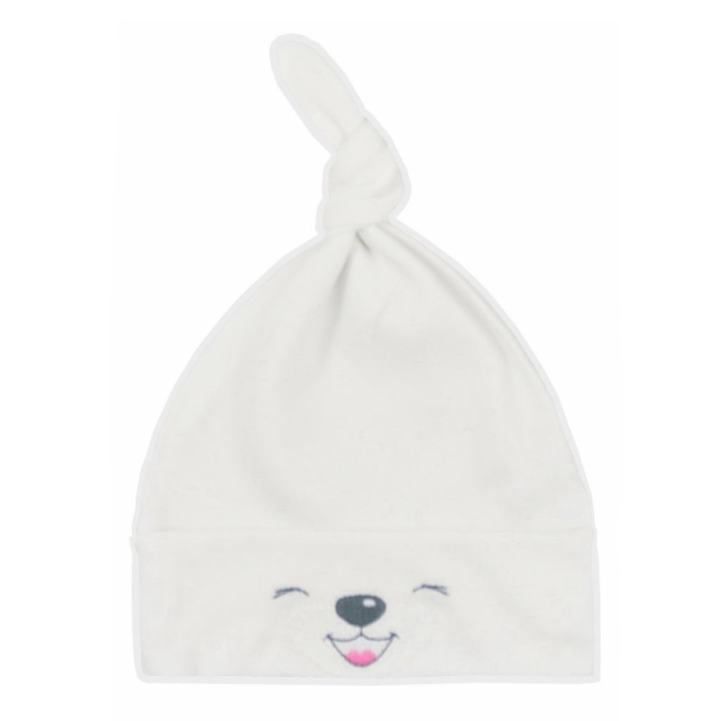 Kojenecká čepička Bobas Fashion Lucky. Krémová barva. Bavlněná čepice je zdobena obrázky usměvavých čumáčků a roztomilým uzlíkem v horní části. Má široký lem, který netlačí na hlavičku miminka. Kojenecké oblečení je z kvalitního materiálu 100% bavlna.