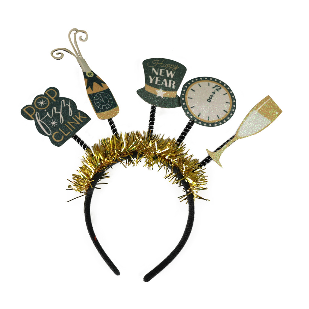 Černozlatá čelenka obohacena drobnými prvky typickými při novoročních oslavách. Ideální ozdoba do vlasů na oslavu nebo večírek při vítání Nového roku!