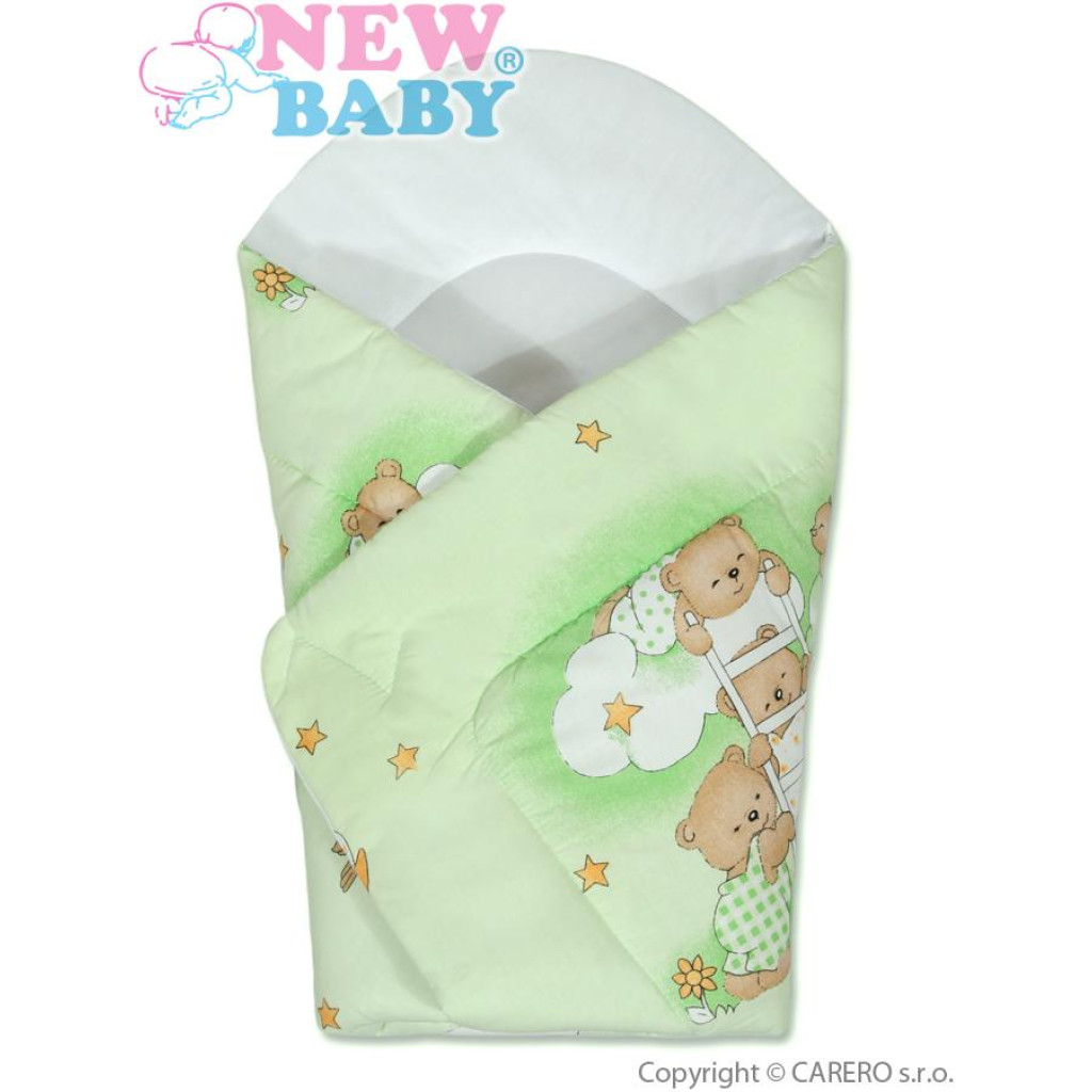Kojenecká zavinovačka v zelené barvě pro miminka. Dětská zavinovačka New Baby. Zavinovačku zdobí obrázky. Zapínání na suchý zip. Rozměry cca 75x75 cm. Složení: povlak 100% bavlna, výplň 100% polyester. Umístění vzoru na zavinovačce se z důvodu strojové výroby mírně liší.