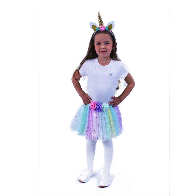 Roztomilá saténová sukýnka TUTU je zdobena barevným tylem s dekorem hvězdiček. Je určena pro holčičky ve věkovém rozmezí 3-10 let (104-146 cm), v pase je na gumu a její délka je cca 26 cm. Součástí této sady je senzační čelenka jednorožce se zlatým rohem a ušima!