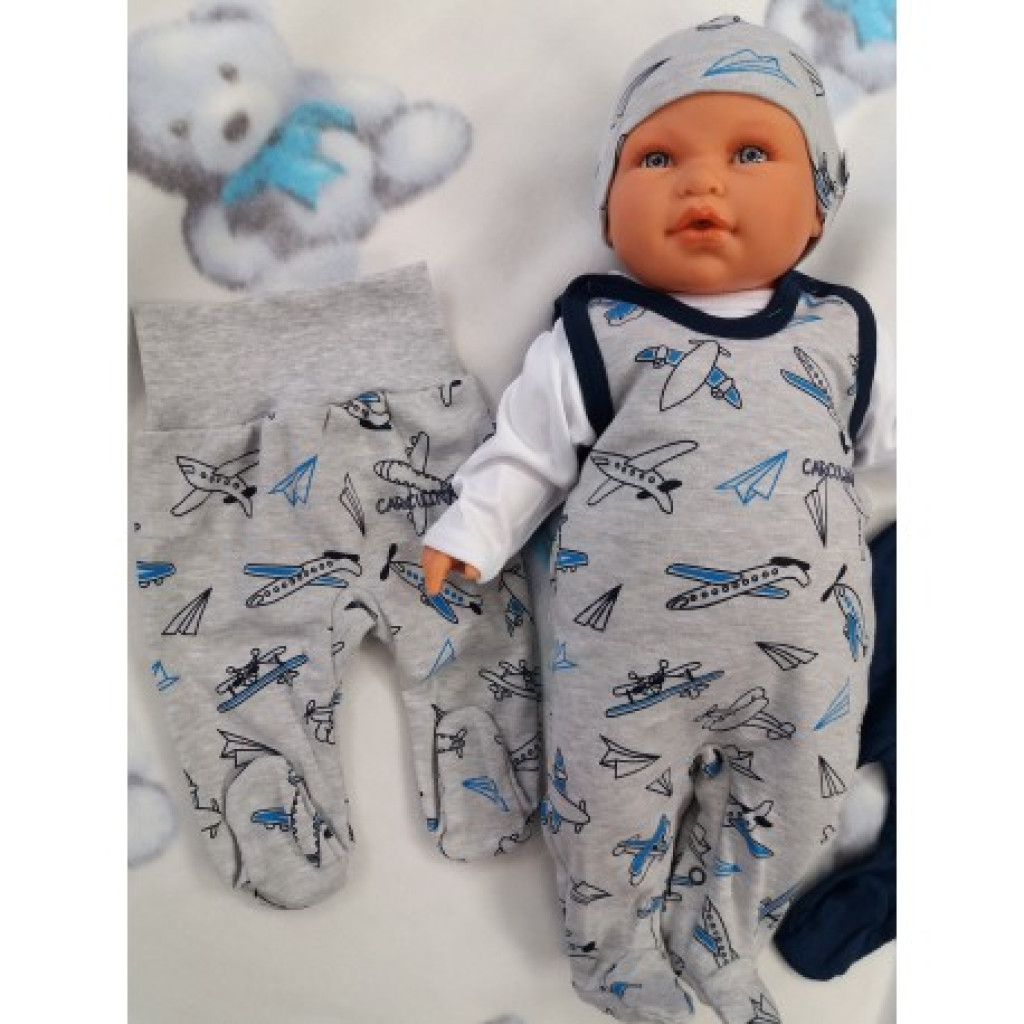 Kojenecké dupačky s motivem modrých letadýlek. Šedá barva. Dupačky jsou se zapínání na patentky na ramínkách a mezi nožičkami. Kojenecké oblečení je z materiálu 100% bavlna. Česká značka. Materiály jsou testované a neobsahují škodlivé látky, proto jsou děti v bezpečí.