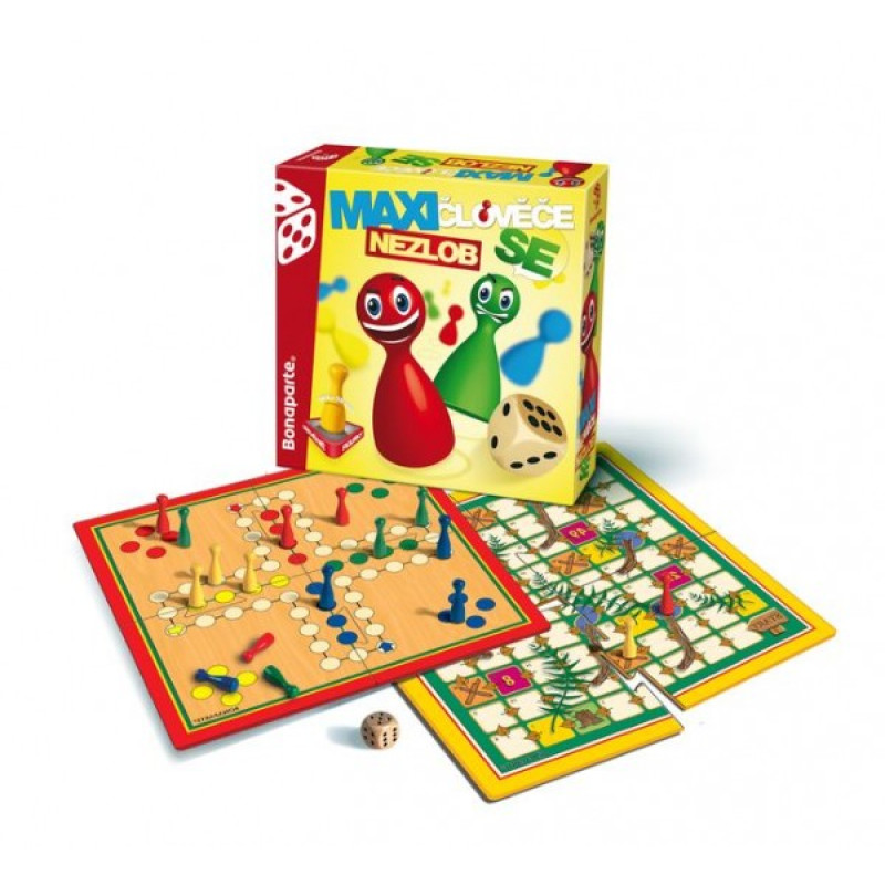 Člověče nezlob se a Lesní závod. Dvě hry v extra velkém provedení, dřevné figurky výška 5 cm, velká dřevěná kosta. Figurky se výborně drží jak těm nejmenším dětem, tak seniorům. Hra obsahuje: oboustranný herní plán, 12 dřevěných figurek, dřevěnou hrací kostku, návod.