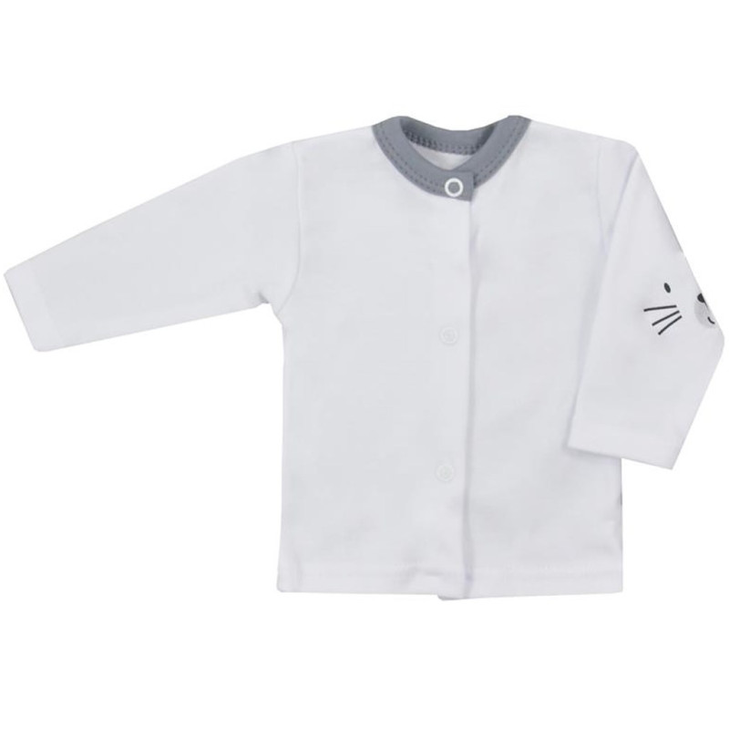 Kojenecký kabátek Koala Swing. Kabátek je v bílé barvě se šedým lemem okolo krčku a zdobí ho obličej veselého králíčka na jednom rukávu. Praktické zapínání na cvočky po celé délce. Kojenecké oblečení je z materiálu 100% bavlna.