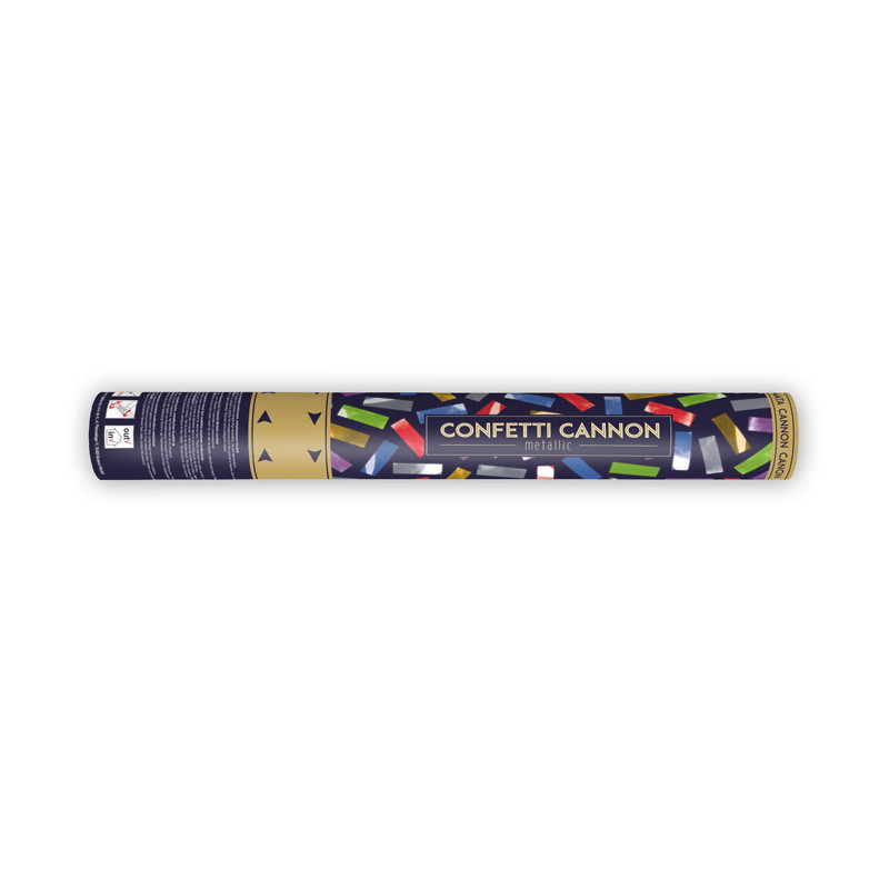 Konfety 40 cm, metalické barevné obdelníčky. Konfety jsou uloženy ve válcovité tubě. Drží se v ruce a ovládají se mechanickým pootočením tubusu. Po vystřelení vyletí barevné obdélníčky do výšky 5 až 8 metrů a rozptýlí se do okolí. Bezpečnost: konfety lze použít ve venkovních i vnitřních prostorách. Bezpečná vzdálenost přihlížejících diváků od tuby konfet je 10 metrů. Iniciace stlačený vzduch.… Tubus kov. Manipulace pootočení. Max délka odpálení 5–8 m. více