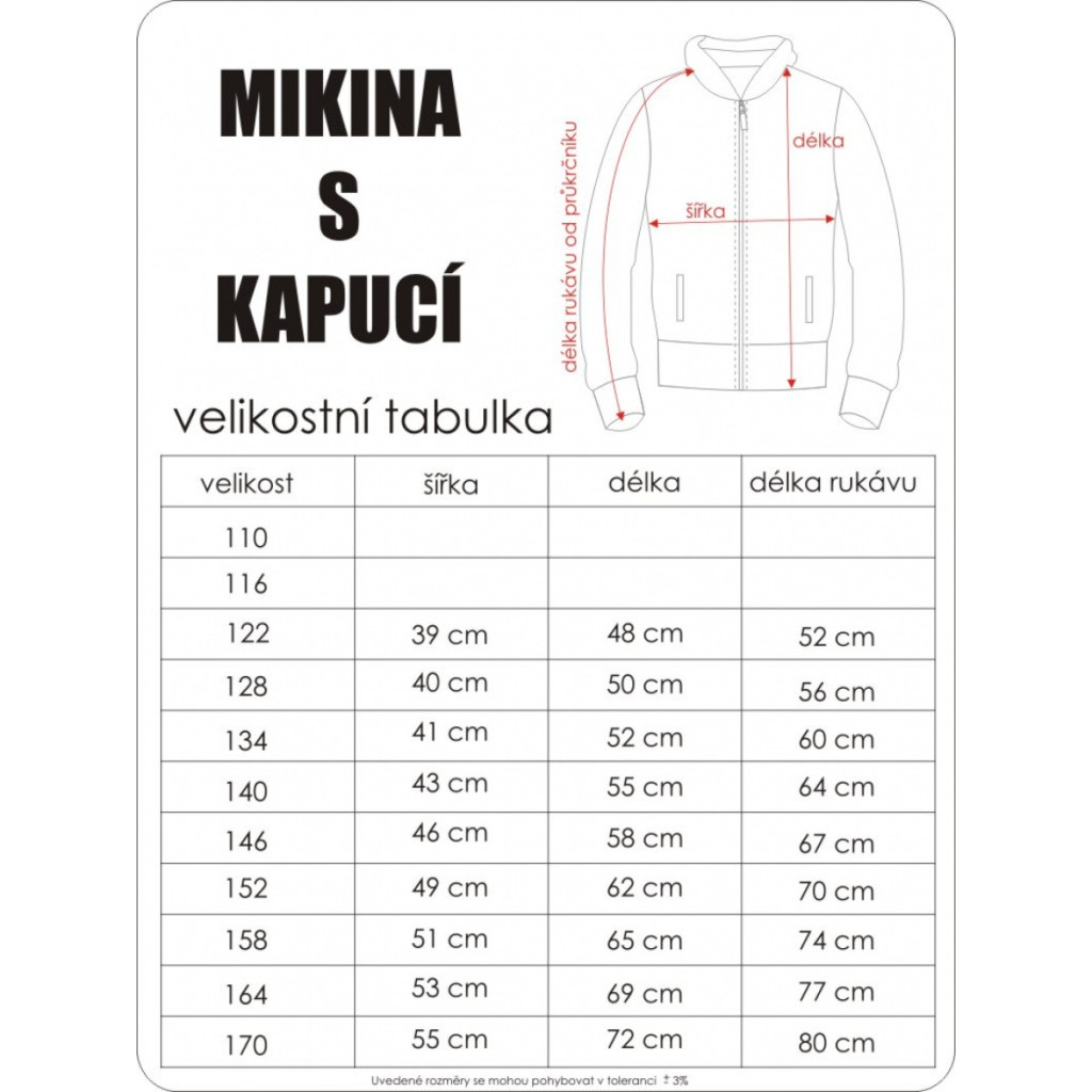 těla ukončena pružným patentem. Do průkrčníku všita kapuce, která je vypodšita 100% bavlnou v barvě šedý melír. Na předním díle moderní chlapecký černý tisk PARKOUR aplikovaný novou technologií 3D tisku. Do kapuce od velikosti 134 a výše navlečena šňůrka barvy vypodšité kapuce.