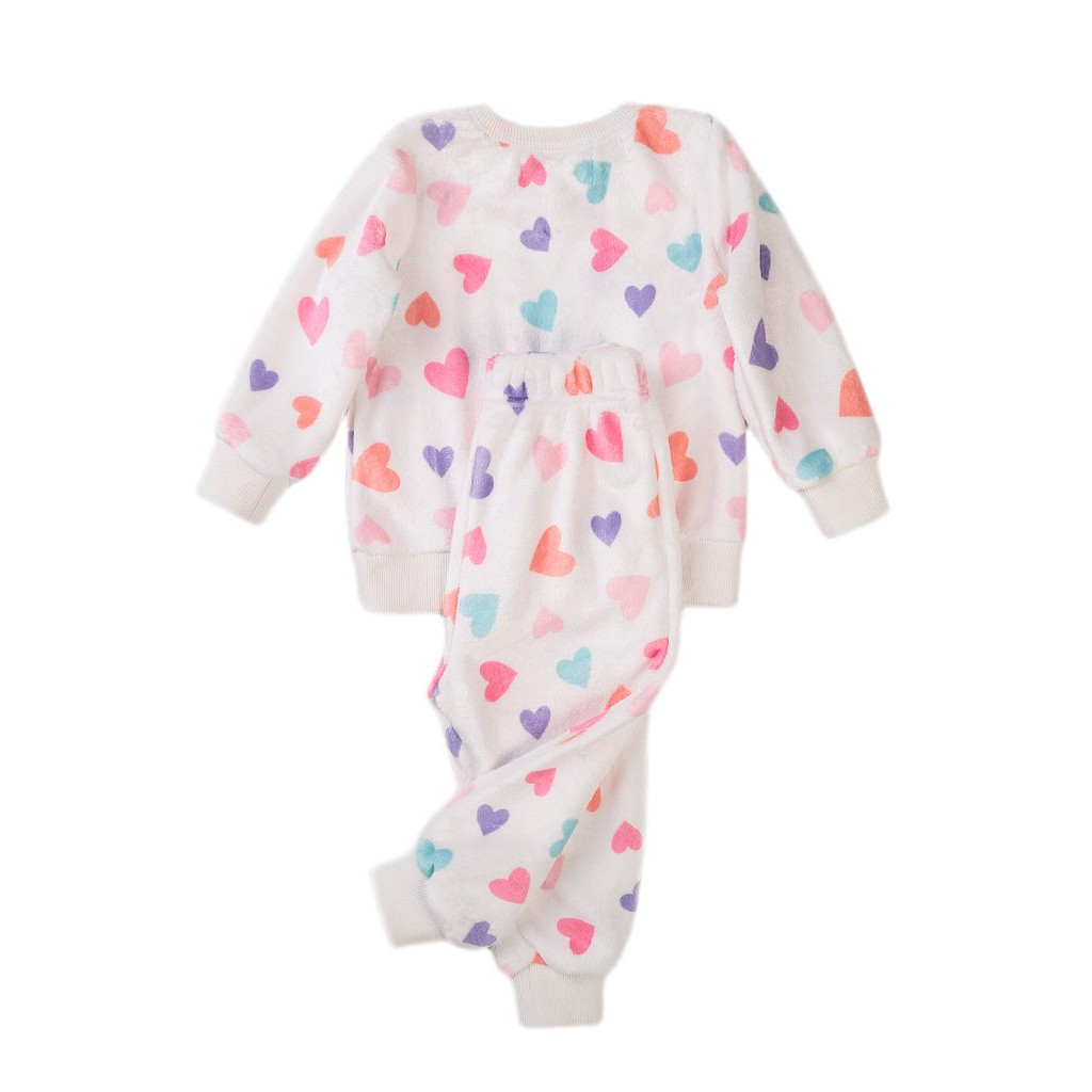Dívčí pyžamo s motivem srdíček. Pyžamo je s dlouhým rukávem. Dětské oblečení je z fleecového materiálu.