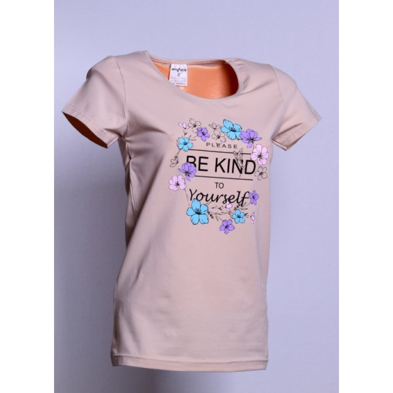 Dámské triko s krátkým rukávem v barvě krémové z příjemného pružného bavlněného jednolícního úpletu s elastanem. Dámské oblečení je z materiálu 95 % bavlna, 5 % lycra. Na předním díle moderní barevný tisk. Česká značka Anyface - Kilian.