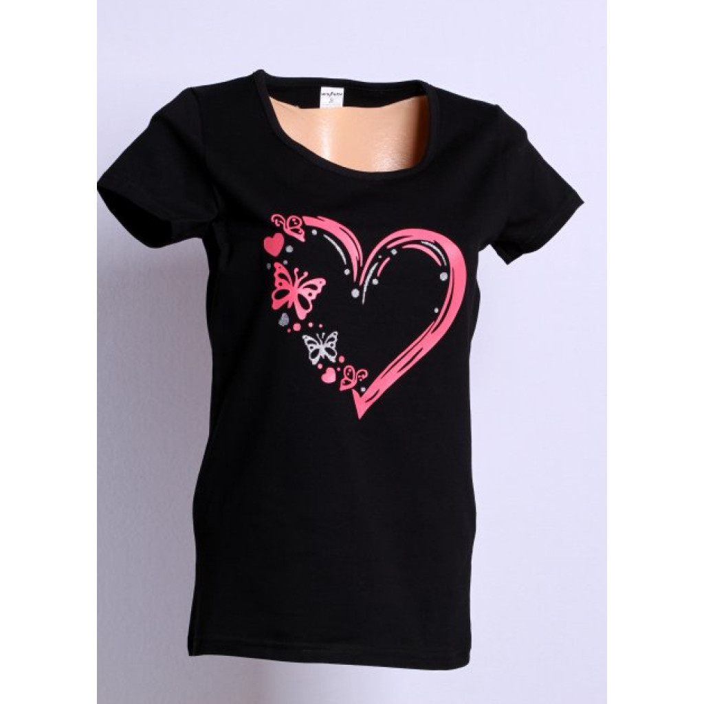 Dámské triko s krátkým rukávem v barvě černé z příjemného pružného bavlněného jednolícního úpletu s elastanem. Na předním díle moderní dívčí tisk srdíčka s motýlky aplikovaný novou technologií 3D tisku oživen stříbrnou třpytivou barvou. Oblečení je z materiálu 95 % bavlna, 5 % elastan, jednolícní úplet. Kvalitní česká značky…