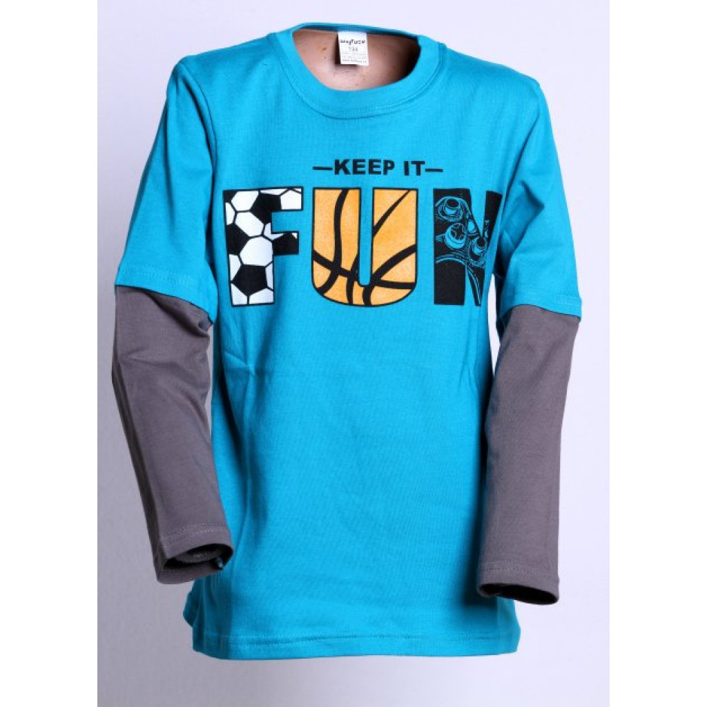 Tričko chlapecké FUN s dlouhým rukávem v barvě tmavý tyrkýz v kombinaci s šedou z příjemného bavlněného úpletu. Dětské oblečení je z materiálu 100% bavlna. Tričko je klasického střihu v kombinaci krátko-dlouhý rukáv. Na předním díle moderní černý chlapecký tisk aplikovaný novou technologií 3D tisku, oživen bílou a oranžovou.
