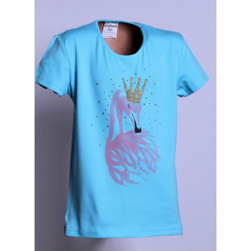 Triko dívčí s krátkým rukávem v barvě tyrkyzové z příjemného pružného bavlněného jednolícního úpletu s elastanem. Na předním díle moderní dívčí růžový tisk plameňák aplikovaný novou technologií 3D tisku oživen zlatou třpytivou barvou. Dětské oblečení české značky Anyface - Kilian.
