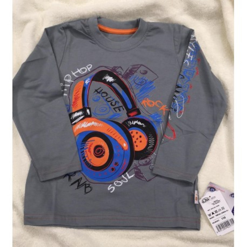 Tričko s dlouhým rukávem a tiskem na přední straně - sluchátka. Chlapecké triko je v šedé barvě. Kvalitní bavlněný materiál. Česká značka Vejnar.