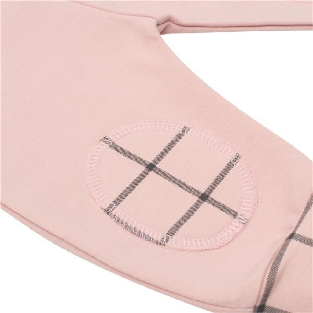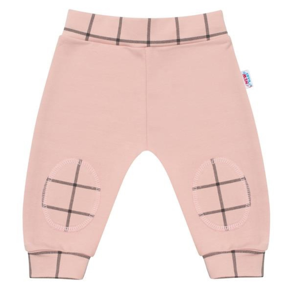 Tepláčky české značky New Baby Cool. Tepláčky mají v pase širší lem s gumičkou, na nohavičkách širší lem a na kolínkách šmrncovní záplaty. Lemy a záplaty jsou ušité z moderní kostkované látky. Složení: 95% bavlna, 5% elastan.