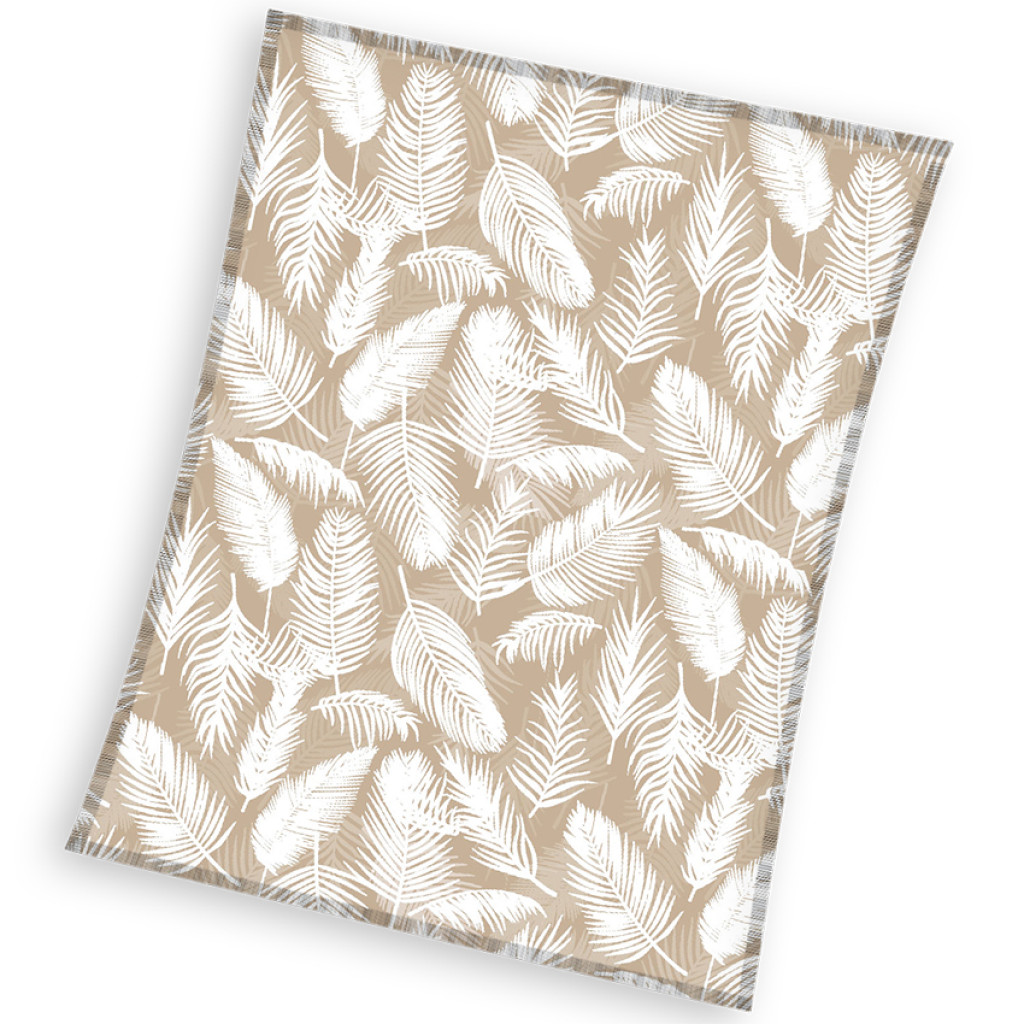 Béžovou deku doplňují bílé obrázky pírek, které nám domů doslova přinesou pohodu a klid