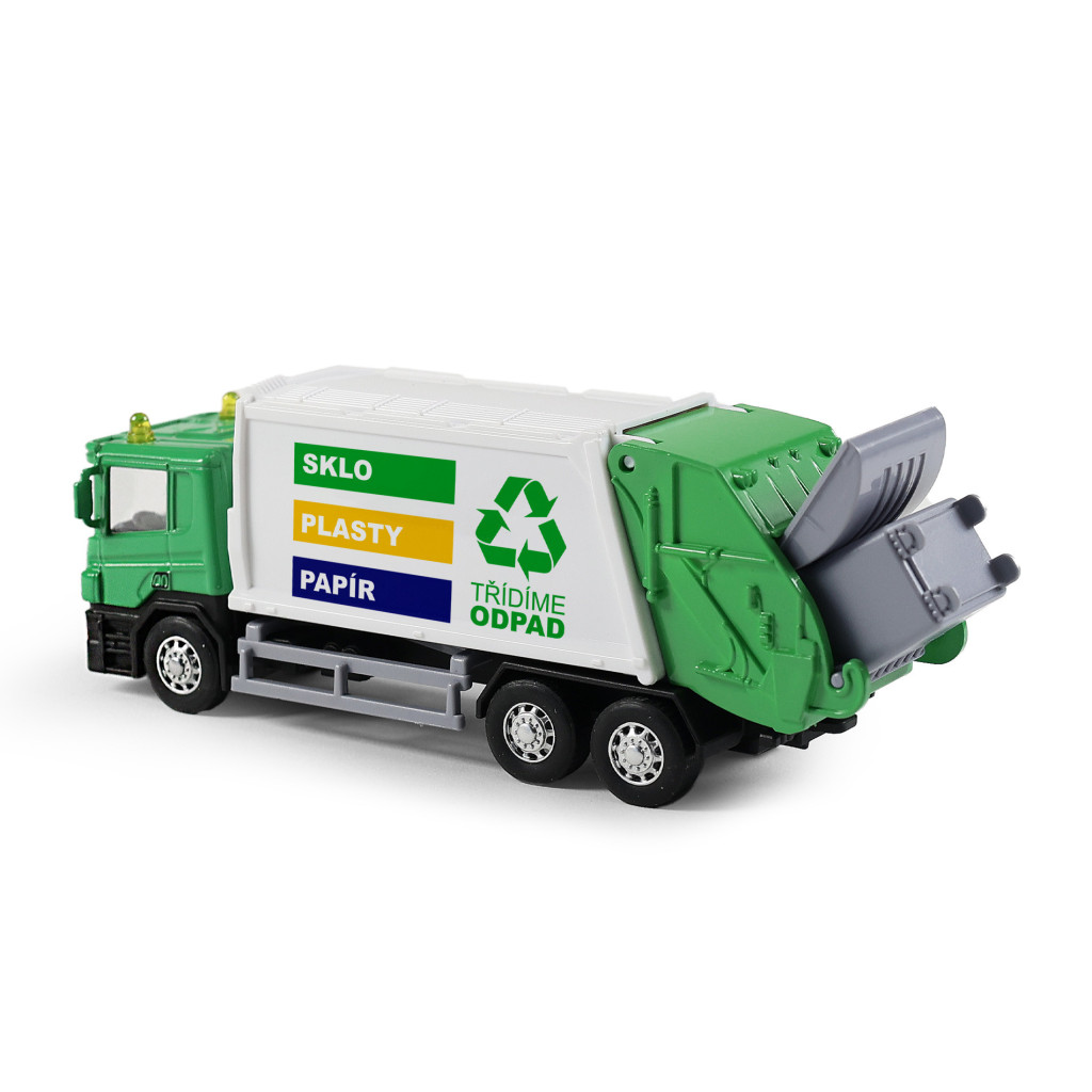 Kovové popelářské auto s plastovou korbou. Korba má v zadní části odklápěcí dveře, součástí je otevírací kontejner. Auto jezdí na zpětný chod a jeho délka je 15 cm.