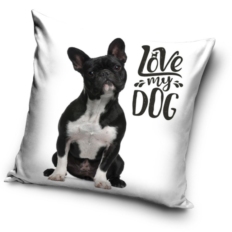 Dekorační polštářek Mám rád svého Buldočka, je vyrobený ze 100% polyesteru a má zipové zapínání. Rozměry polštářku jsou 40x40 cm a výplň tvoří netkaná textilie.
