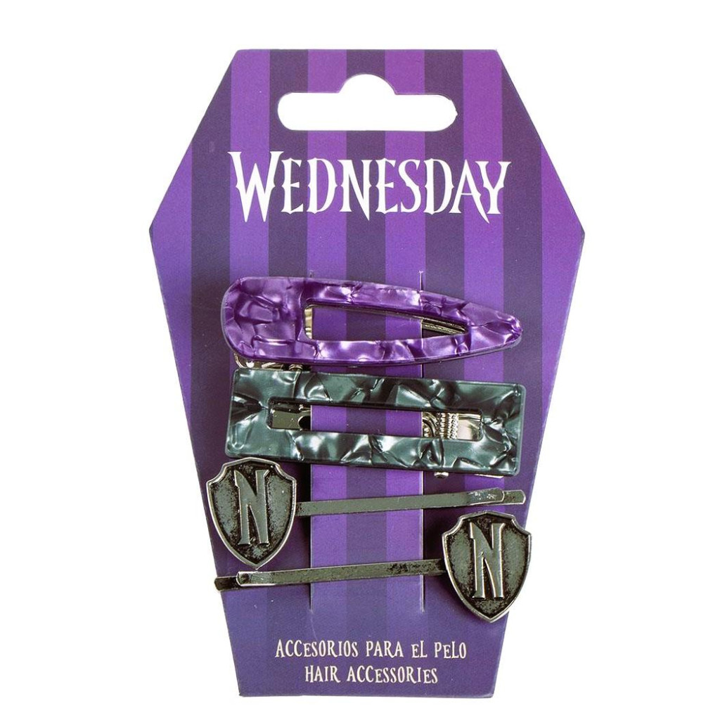 Sada 2 sponek a 2 klipů do vlasů s motivem Wednesday.