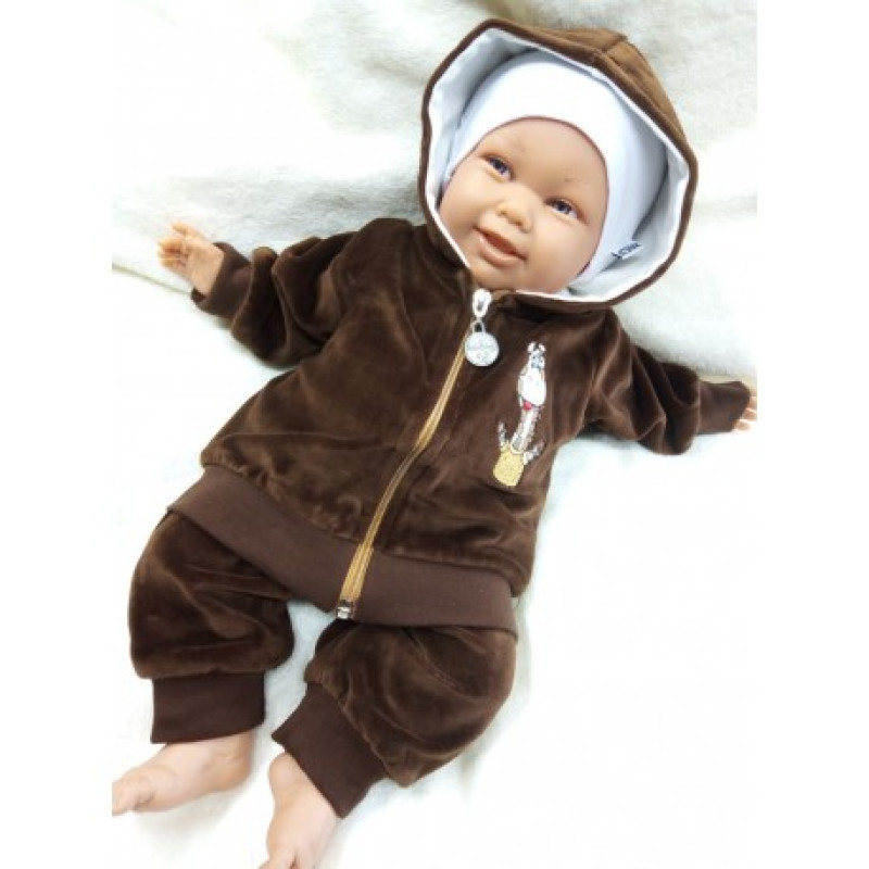 Sametový komplet. Mikina na přední straně na zip. Kalhoty šité do gumy. Rukávky a nohavičky jsou do pružných nápletů. Výšivka na pření straně mikiny a na nohavičce. Velmi kvalitní samet.