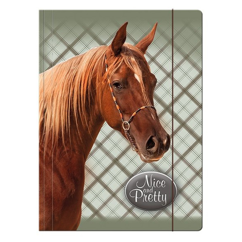Papírová složka na dokumenty s motivem Hnědý kůň. Hnědá barva. Dětské desky na sešity formátu A4 jsou s gumičkou a s potiskem hnědého koně. Složka na sešity je z materiálu: pevný, lesklý karton, rozměry: 24 x 31,5 cm.